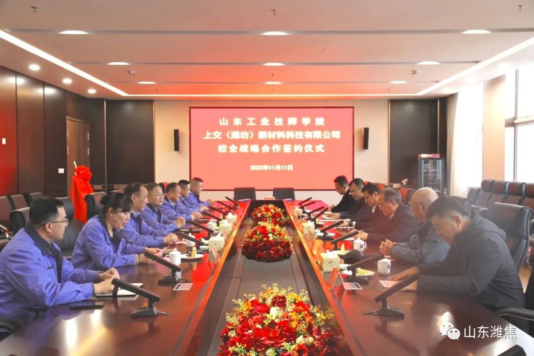 11月11日下午,上交(濰坊)新材料科技有限公司與山東工業(yè)技師學(xué)院校企戰(zhàn)略合作簽約儀式在集團(tuán)總部舉行。濰坊市工業(yè)發(fā)展促 進(jìn)中 心副主任王偉京、濰坊市工信局調(diào)研員李玉軍,山東工業(yè)技師學(xué)院黨委書記孫科順、副院長解成聯(lián),集團(tuán)董事長劉良玉、總經(jīng)理王讀福、副總經(jīng)理呂紅、徐子寧等出席簽約儀式。